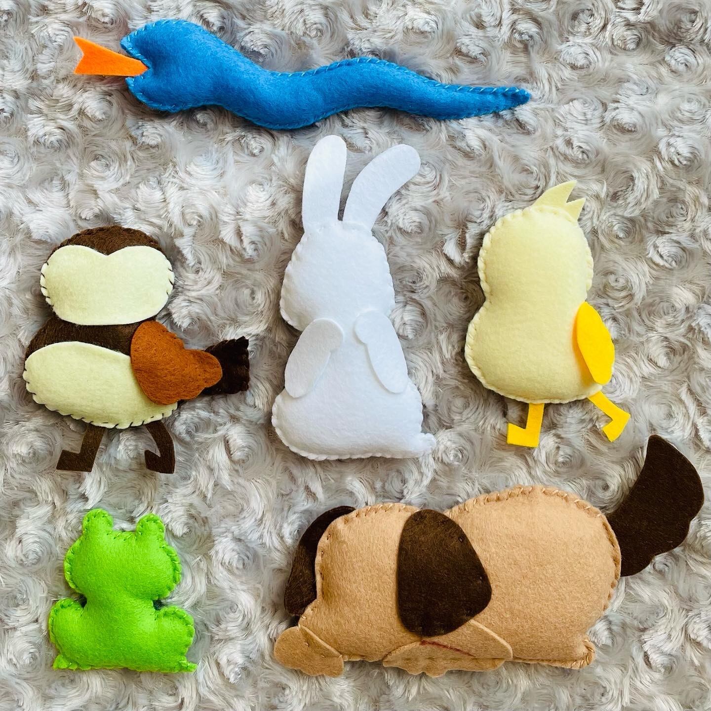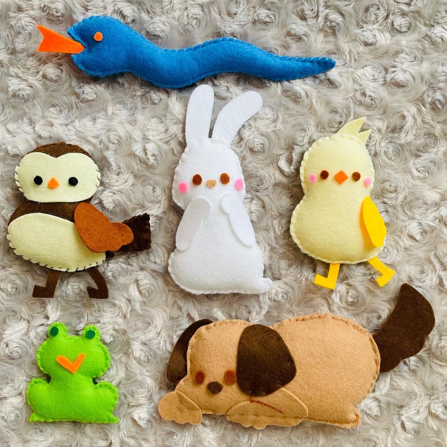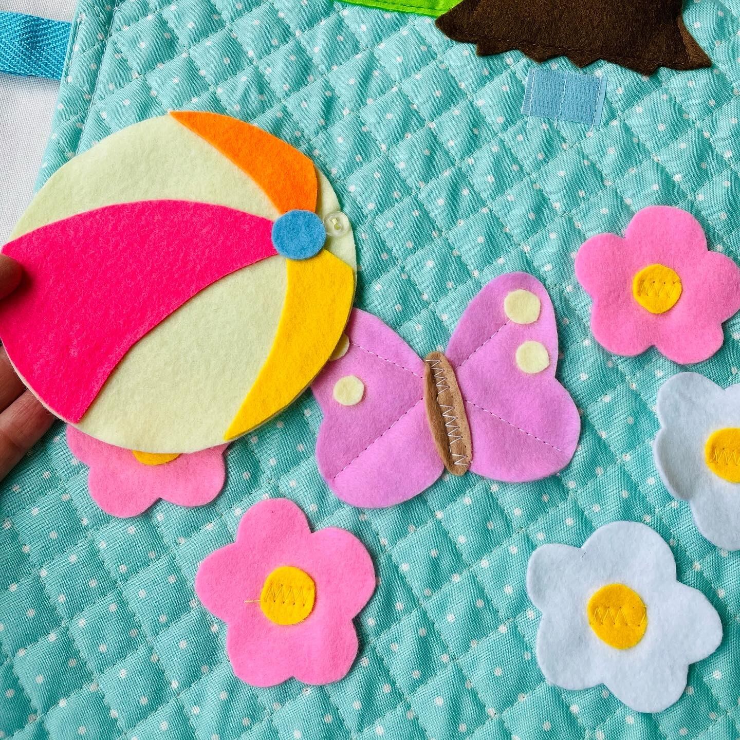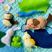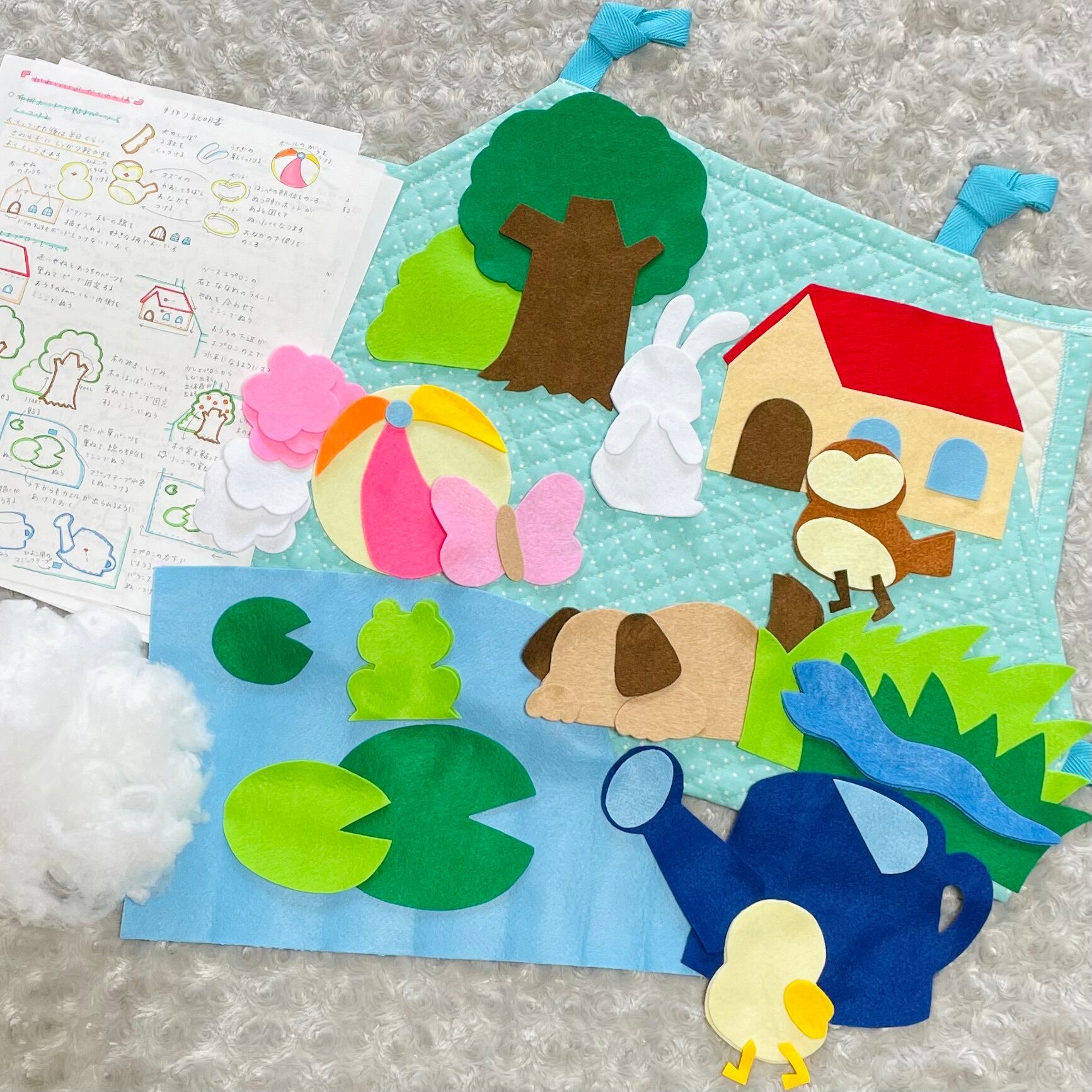 いきものの顔や木やお家の飾りなど1部の材料は自分で好みにカットできるようフェルトのはぎれを入れています