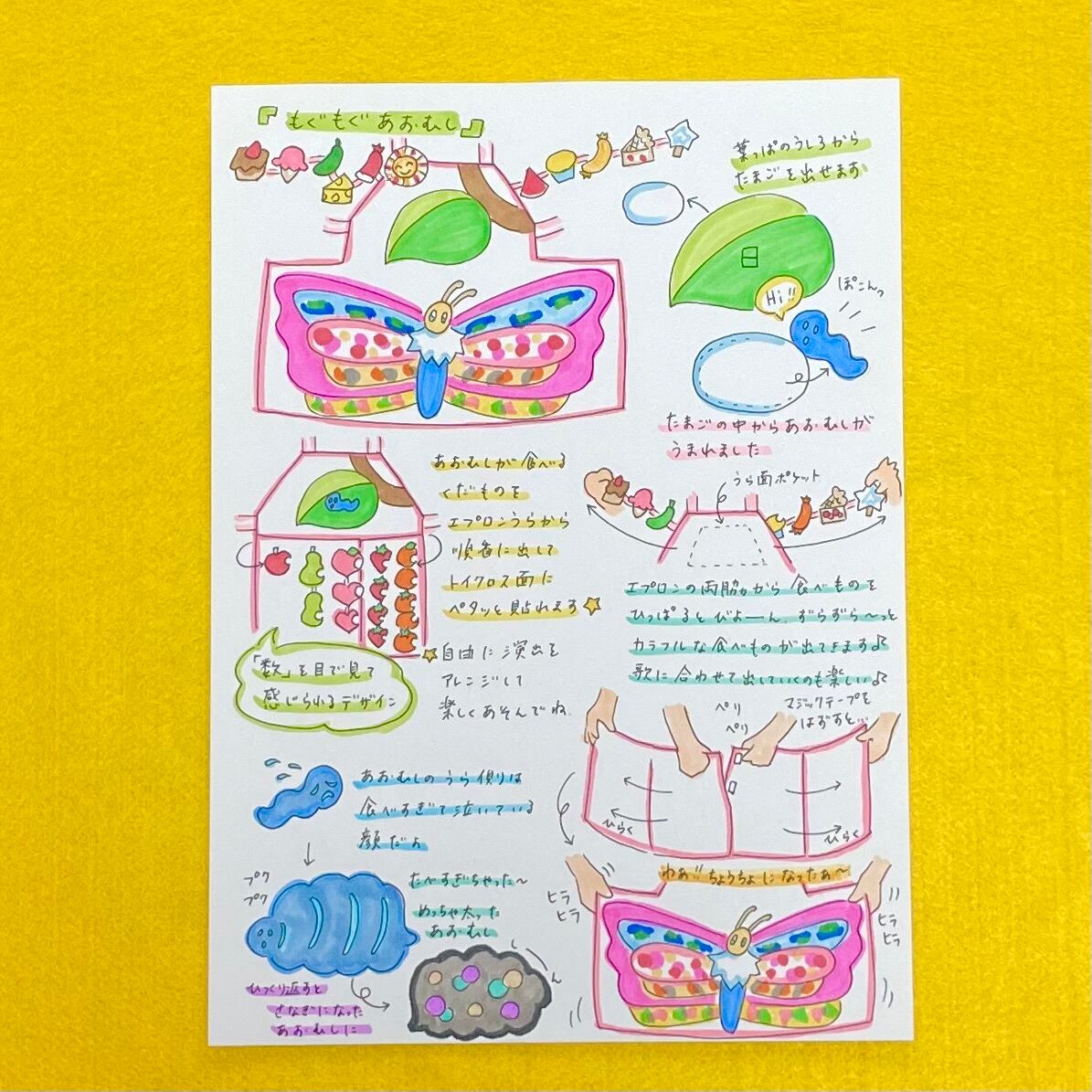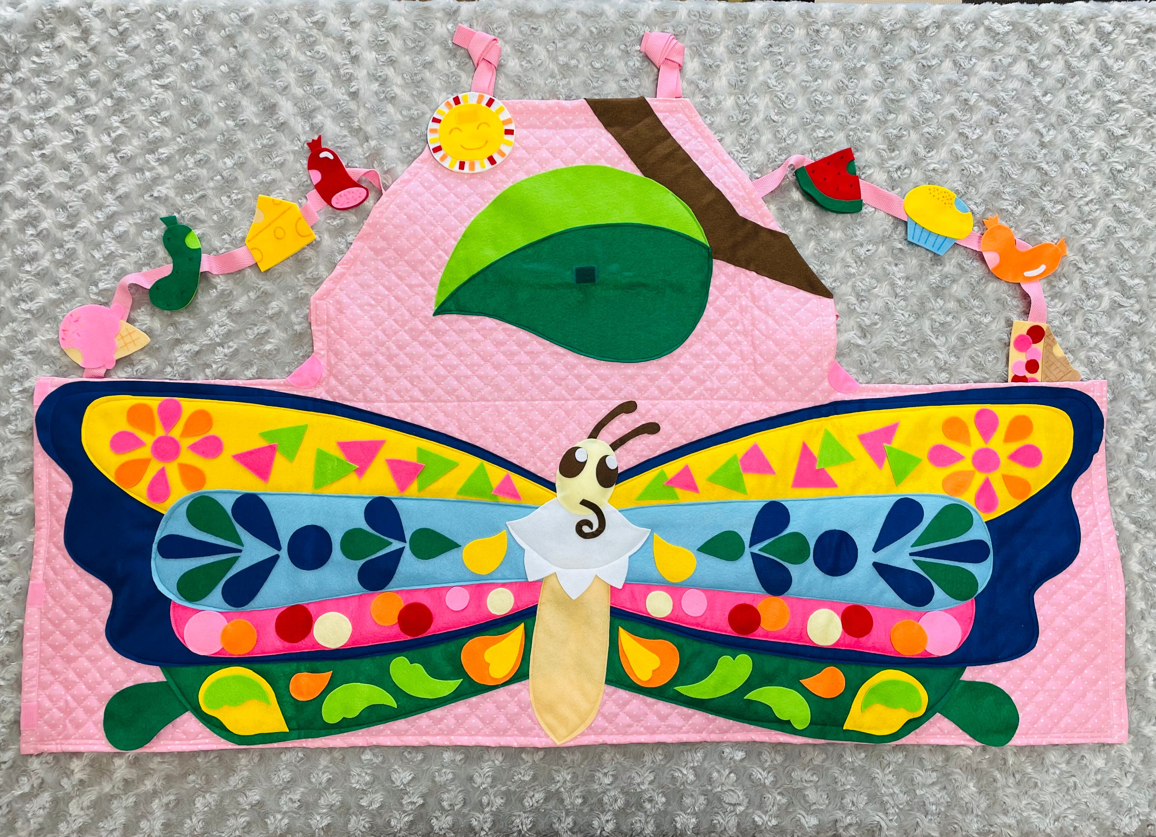 最後にマジックテープをほどいてエプロンを大きく開くとカラフルで鮮やかに変身したちょうちょが大きく羽ばたく仕掛けになっています