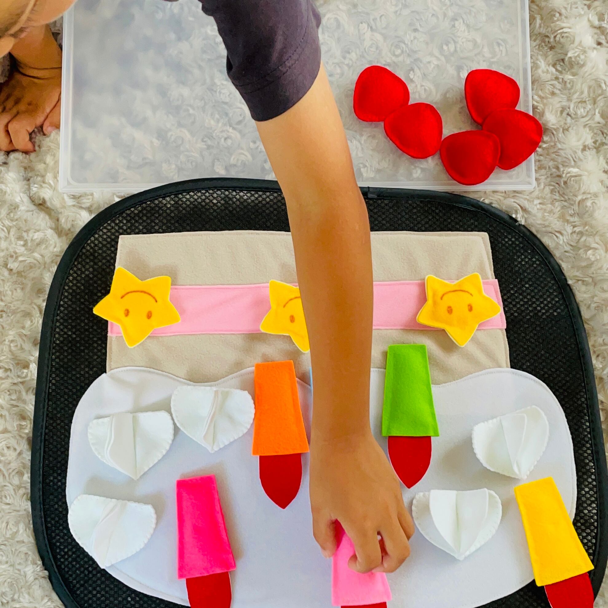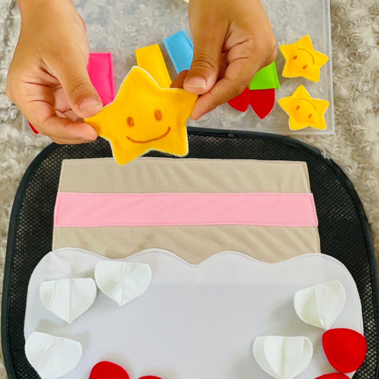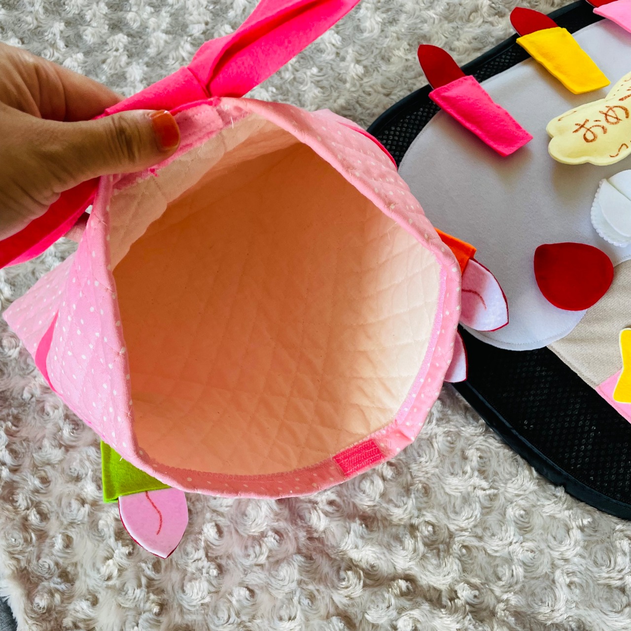 マジックテープ付きのパーツをデコレーションして遊ぶことができます♪